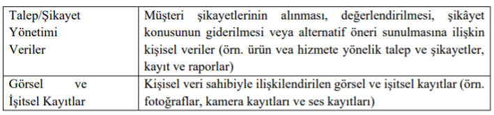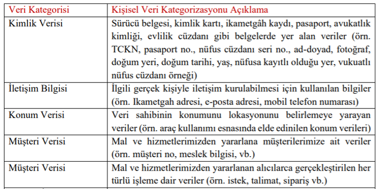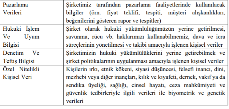 VII. Şirketimiz Tarafından İşlenen Kişisel Verilerin Kategorizasyonu